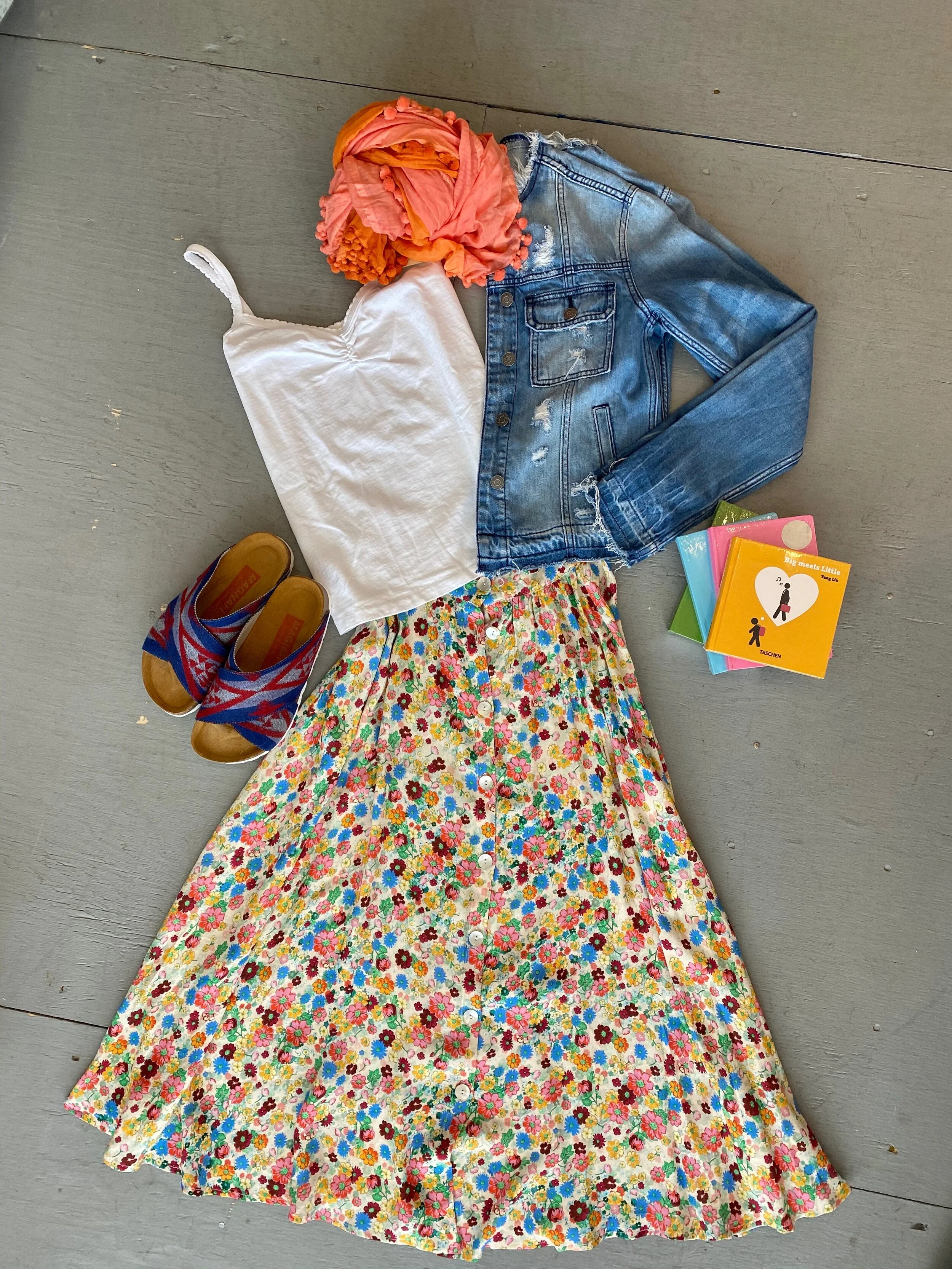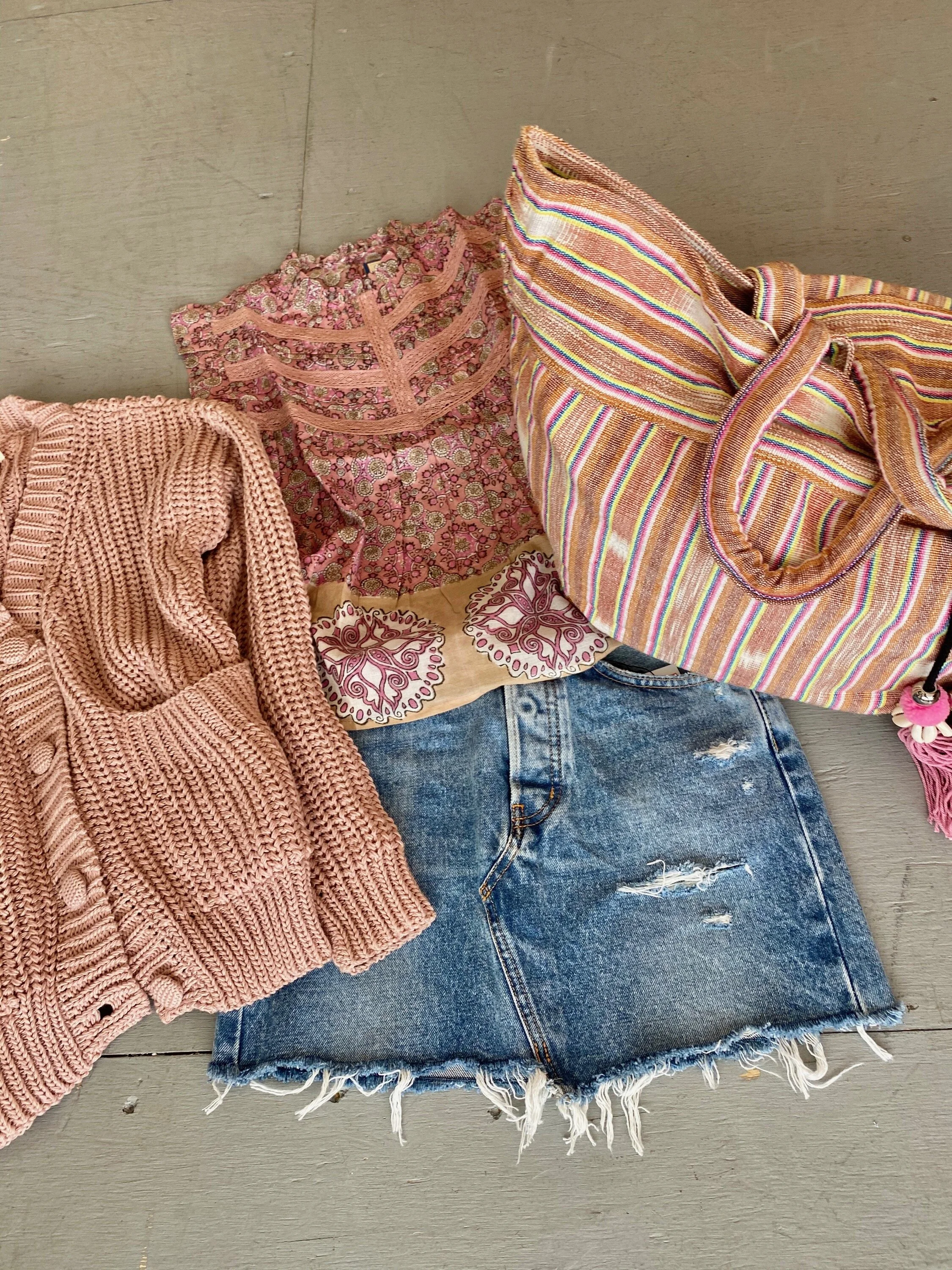 If you're not a denim short person, then perhaps a denim skirt is better. Paired here is a super light-weight feminine blouse, which is accessorized with a tonal cardigan and beachy tote.