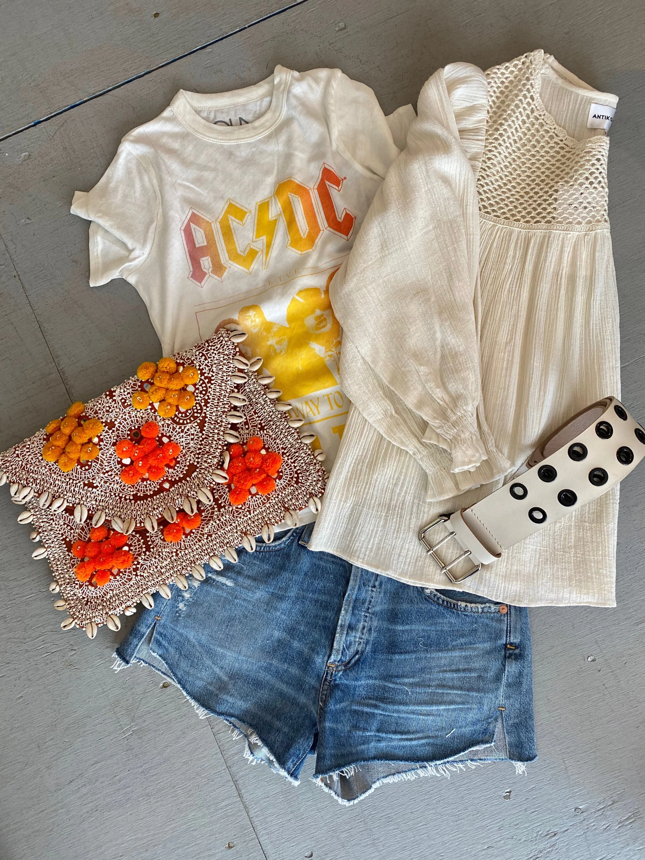 Jean shorts are a summertime staple. Wear two ways with a graphic rocker tee or lightweight summer boho top. Finish the look with a cool belt and summery bag.