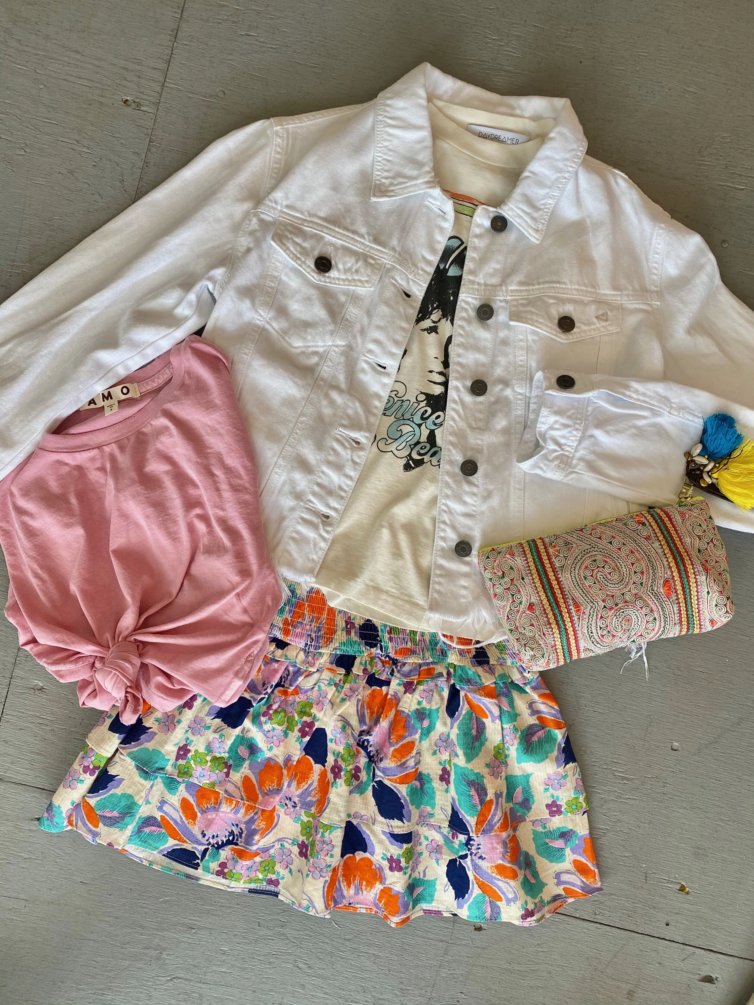 Nothing is better for a hot day than a flared mini skirt. Mixing prints here or pairing with a great pale-colored tee is perfect with a golden tan. Take that white denim jacket with you for those cool, breezy sunsets in the evening.