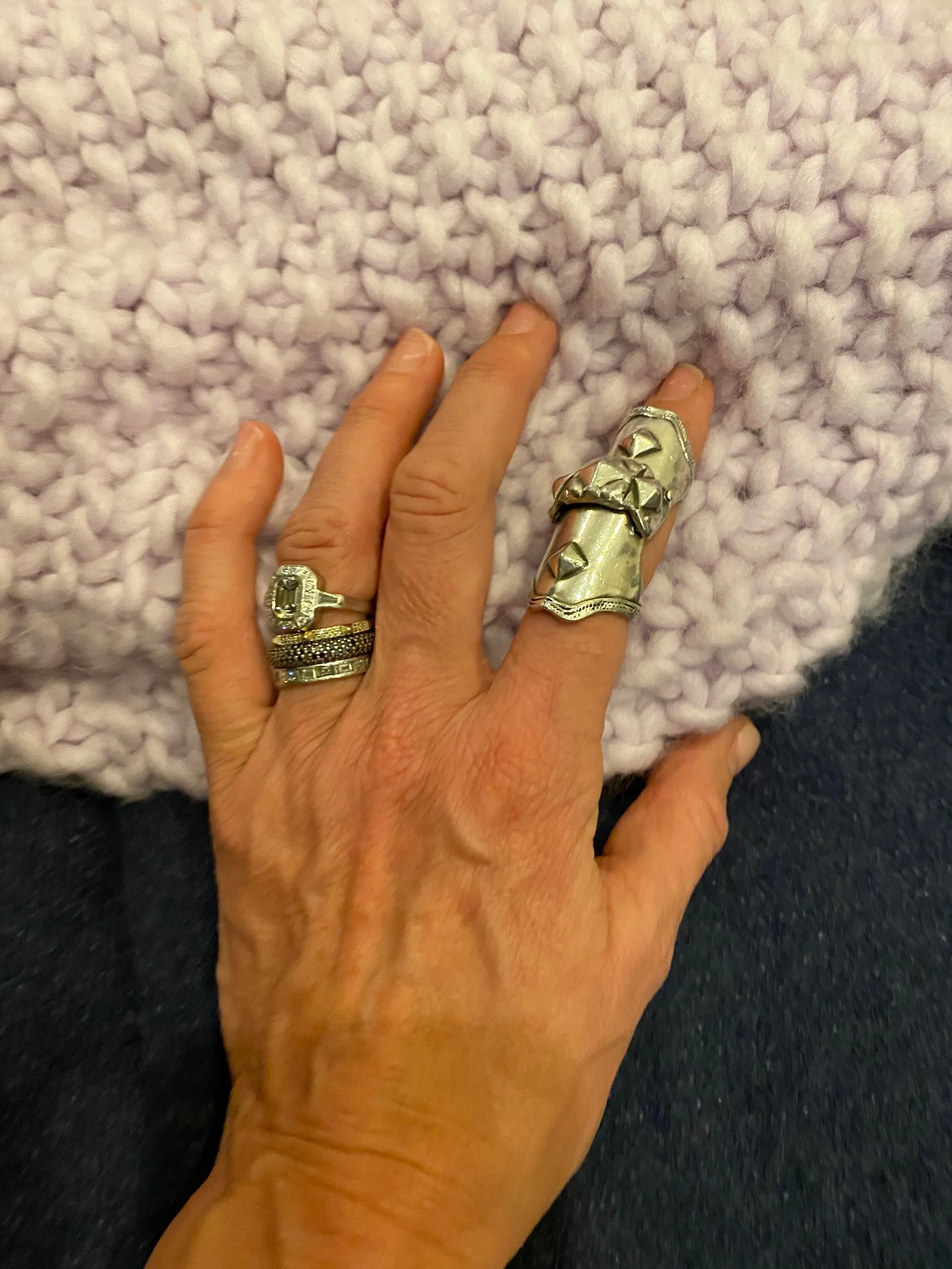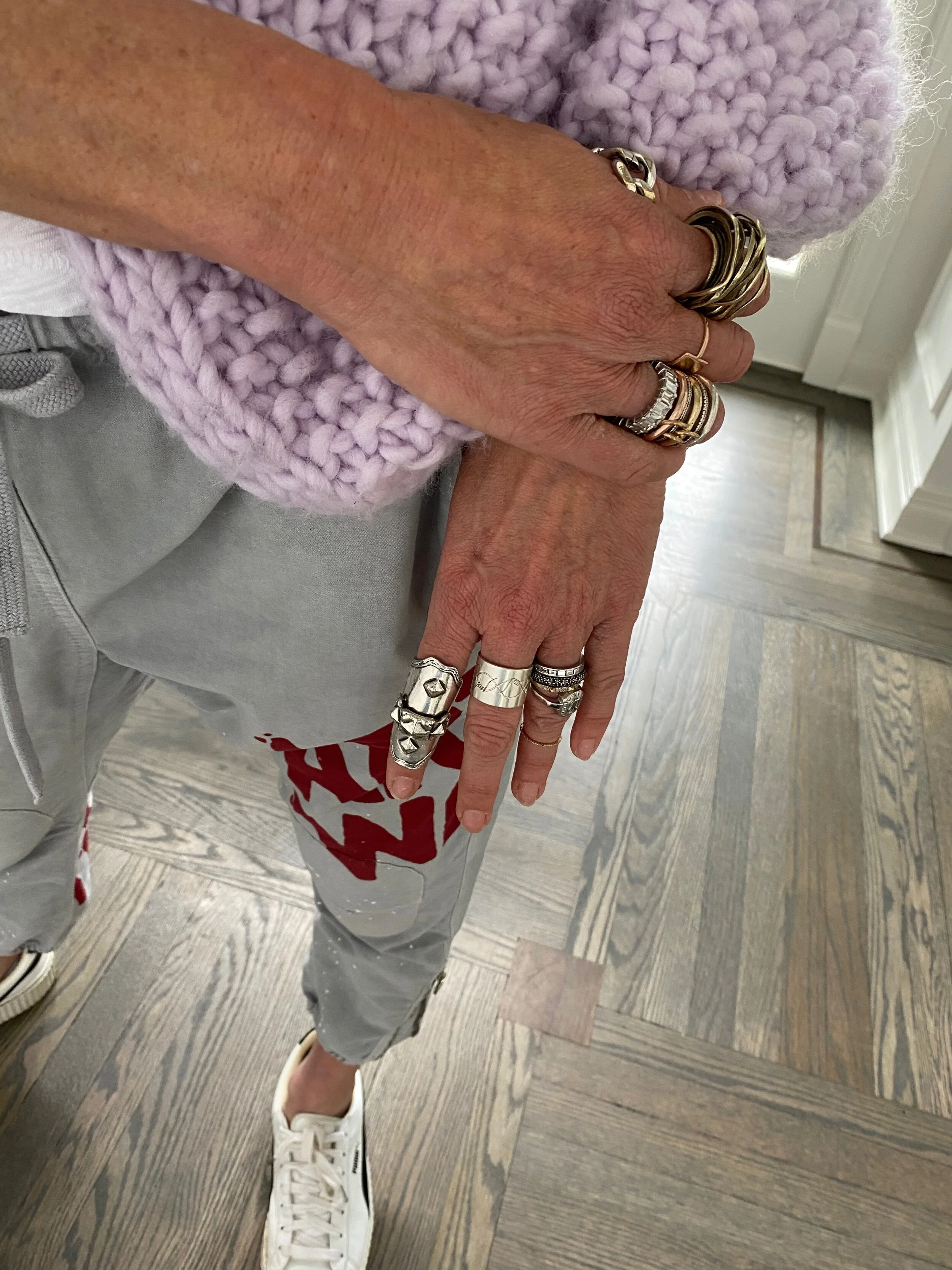 I often wear up to 12 rings - all fingers with possible multiples except my pinky, which I haven’t yet found the perfect ring for.  I mix metals.  Many are “costume,” including one that I bought at a kiosk in Grand Central Terminal, and some cost under $75.  The one that I get asked about  almost daily is the knuckle ring on my left pointer finger.  What is crazy is that everyone from the gentleman who works at Shell gas station where I often buy my son his jumbo sunflower seeds, to a sales associate in the Chanel store is attracted to this ring.  The majority of people who compliment it say they wouldn’t actually wear it, and yet they like it.  For me, I always wear what I love and feels right.  From rings to clothes to shoes and accessories, you have to wear what you love.  Sometimes I take risks and push the envelope and other times I rely on go to pieces that always make me feel good (and thin!).